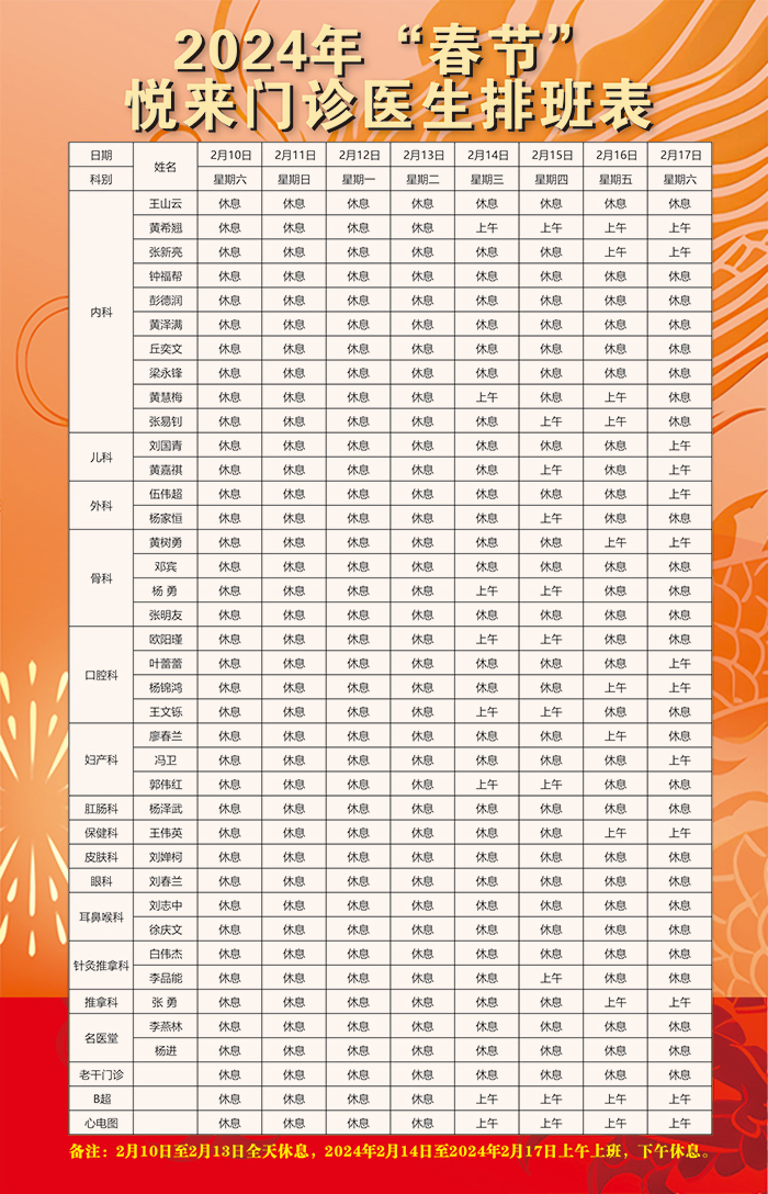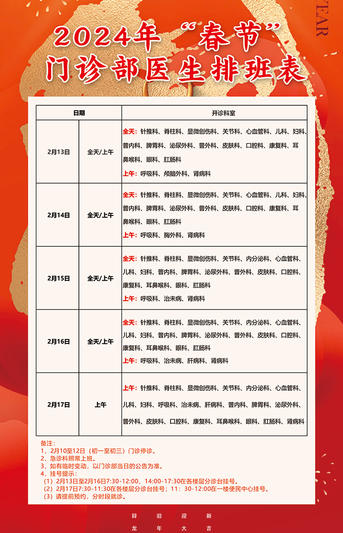 2024年”春节“中山市中医院各门诊部排班表