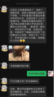 2021年6月5日微信复诊,咽痛好转,诉求:继续解决咽痛及同时解决进食后腹胀。舌暗红苔白厚腻。
