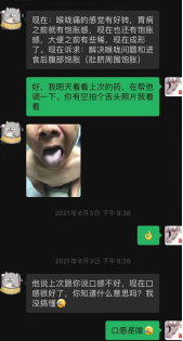 2021年6月11日微信复诊,偶咽痛,痛感减轻,无腹胀,舌暗红,苔白厚腻较前明显减轻。诸症好转,守前方。
