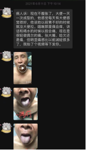 2021年6月11日微信复诊,偶咽痛,痛感减轻,无腹胀,舌暗红,苔白厚腻较前明显减轻。守前方。