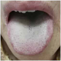 2019年8月7日初诊。患者头痛10余年,右颞部牵扯样疼痛,疼痛反复,每次头痛持续数日,伴有颈部僵硬和周身疼痛,苦不堪言。细问疼痛具体位置,患者从耳周疼痛位置沿身体右侧从上到下画下来。来诊症见心情烦躁,手抚右侧头部,牵扯样头痛,口苦口干,纳眠尚可,二便正常。舌质偏红,苔白厚腻(图1),脉弦滑。
