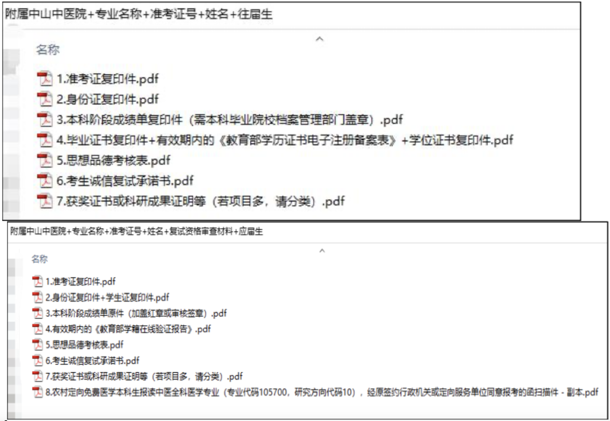 上述材料清晰扫描件,文件按顺序排列、准确命名,于2024年3月25日下午17点前,发至:fszszyyfs@163.com 。邮件统一命名为:附属中山中医院+专业名称+准考证号+姓名+复试资格审查材料。