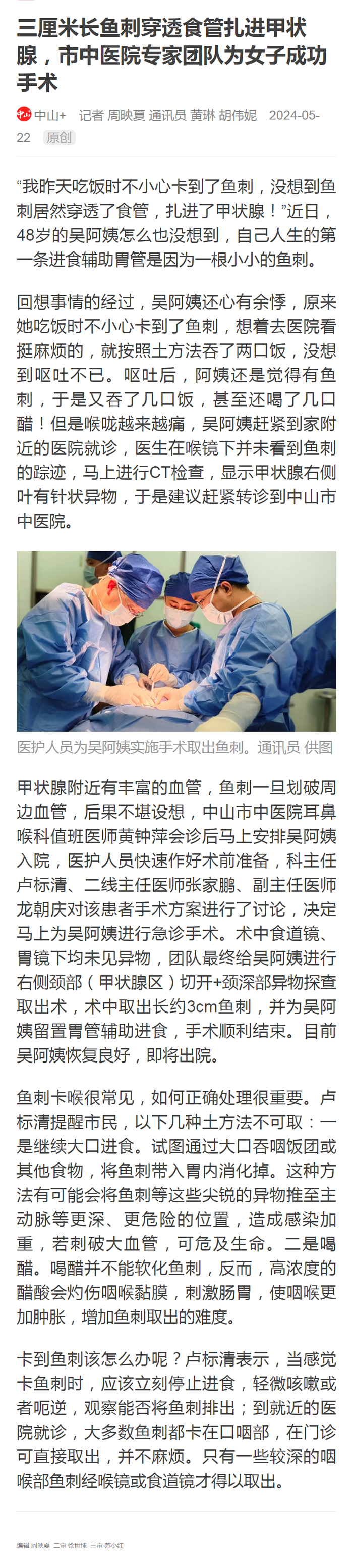 三厘米长鱼刺穿透食管扎进甲状腺,市中医院专家团队为女子成功手术