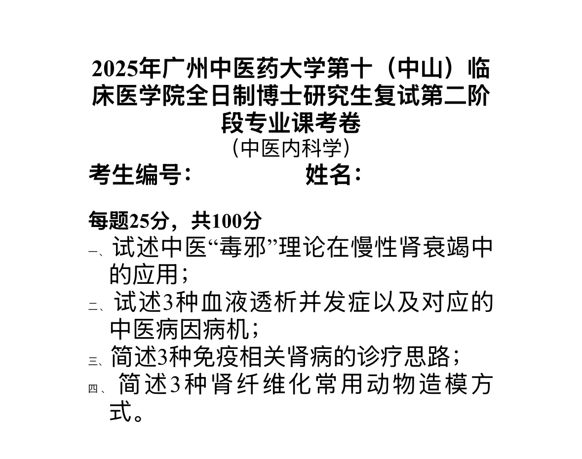 1.专业课考核(满分100分):专业课进行开放式考核。考卷见附件1,考生根据试题要求,进行手写答题,书写的答卷以PDF形式,于2025年5月26日上午12点前(命名方式:考生编号+姓名+专业课考核)发至fszszyyfs@163.com。