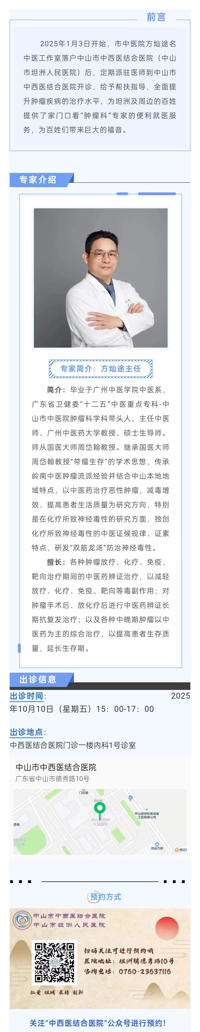 【医讯】10月10日本周五下午肿瘤科方灿途主任医师赴市中西医结合医院坐诊