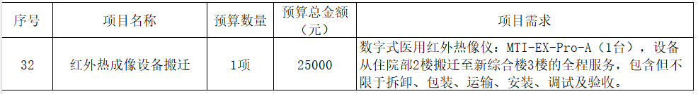 我院计划采购以下红外热成像设备搬迁服务项目,现予以公示,欢迎各供应商推荐相应产品: