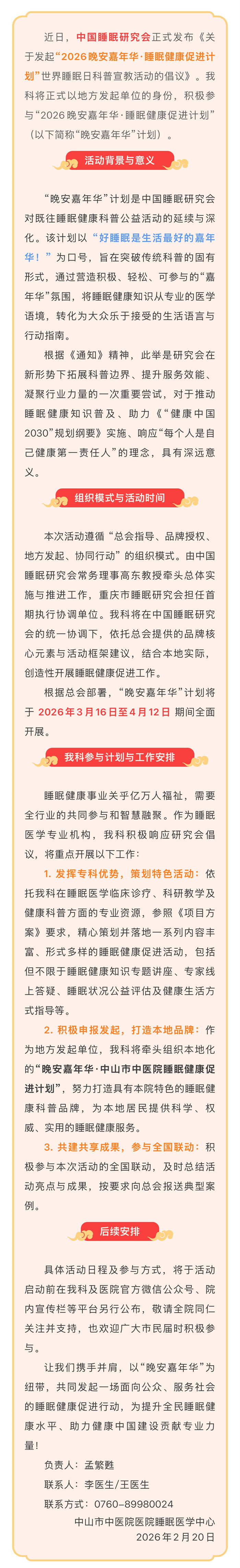 积极响应总会倡议 |中山市中医院睡眠医学科正式参加“2026晚安嘉年华·睡眠健康促进计划”活动