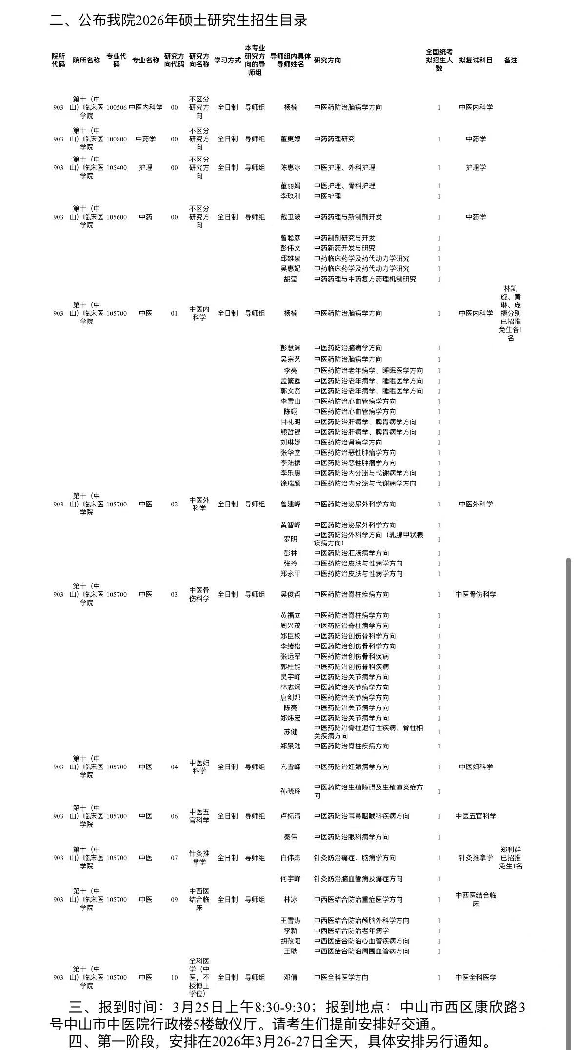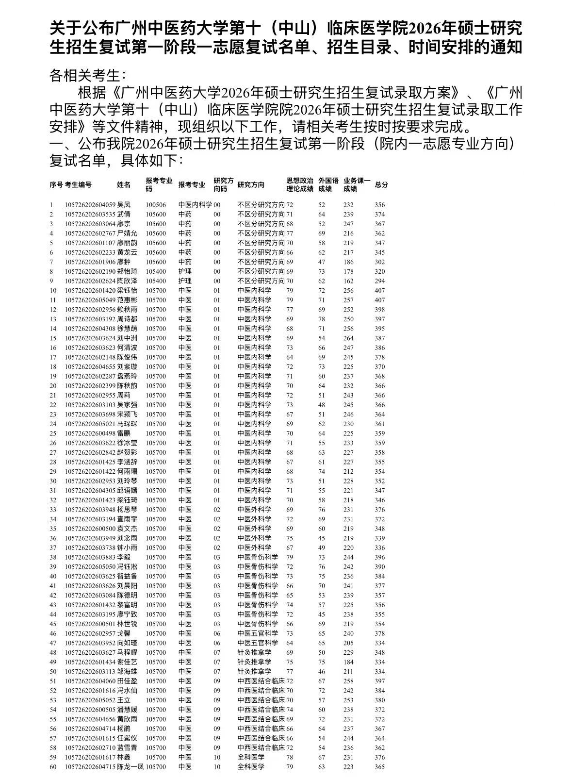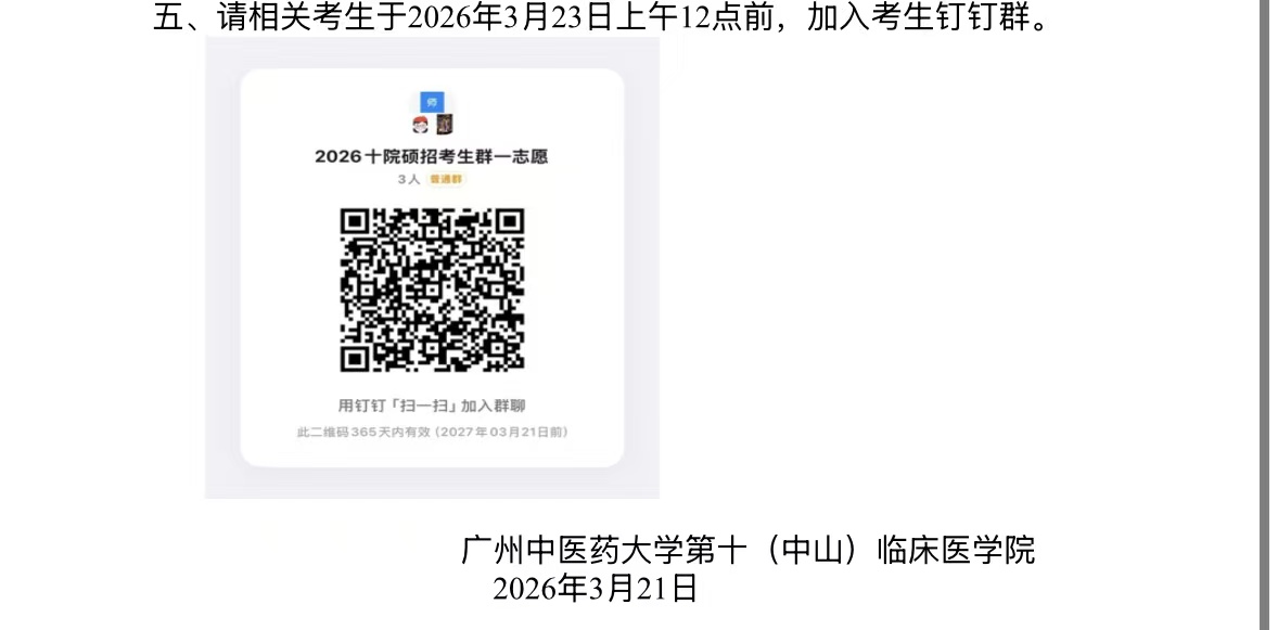 关于公布广州中医药大学第十(中山)临床医学院2026年硕士研究生招生复试第一阶段一志愿复试名单、招生目录、时间安排的通知