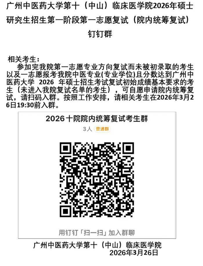 广州中医药大学第十(中山)临床医学院2026年硕士研究生招生第一阶段第一志愿复试(院内统筹复试)钉钉群