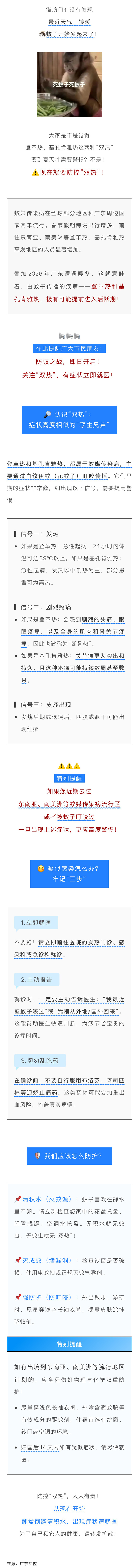 警惕!近日蚊子增多,登革热和基孔肯雅热“双热”来袭,疑似症状必就医!