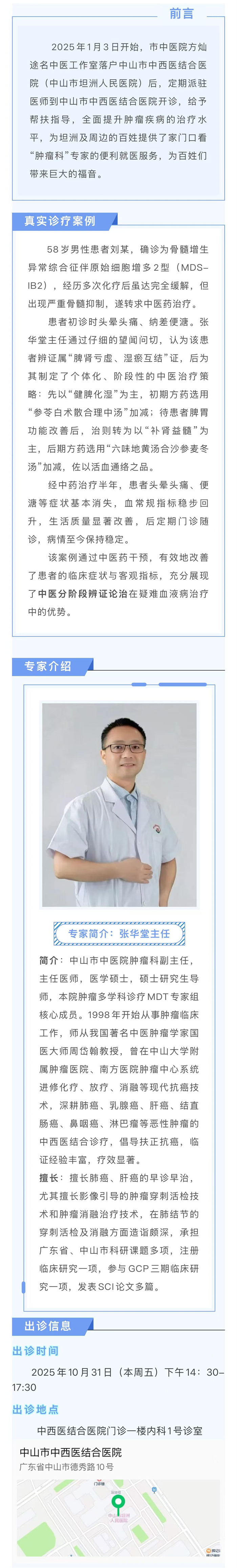 【医讯】10月31日本周五下午肿瘤科张华堂主任医师赴市中西医结合医院坐诊