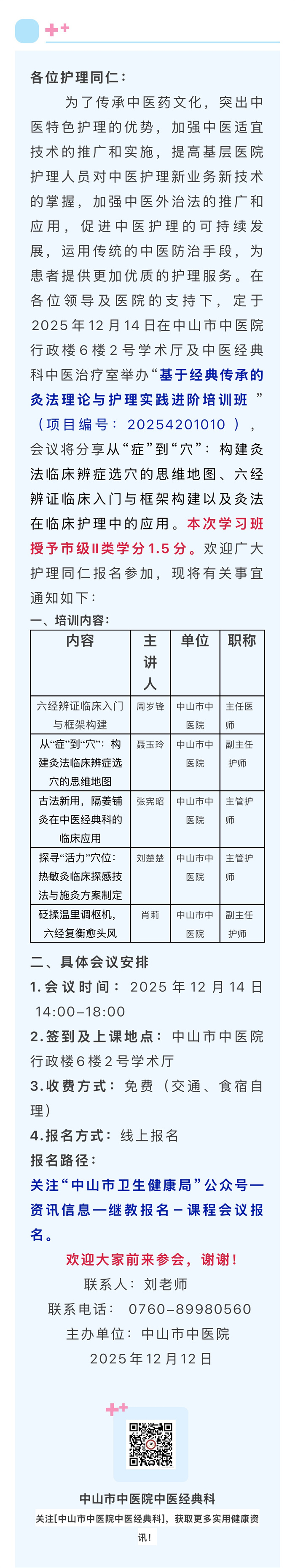 关于举办“基于经典传承的灸法理论与护理实践进阶培训班 ”的通知