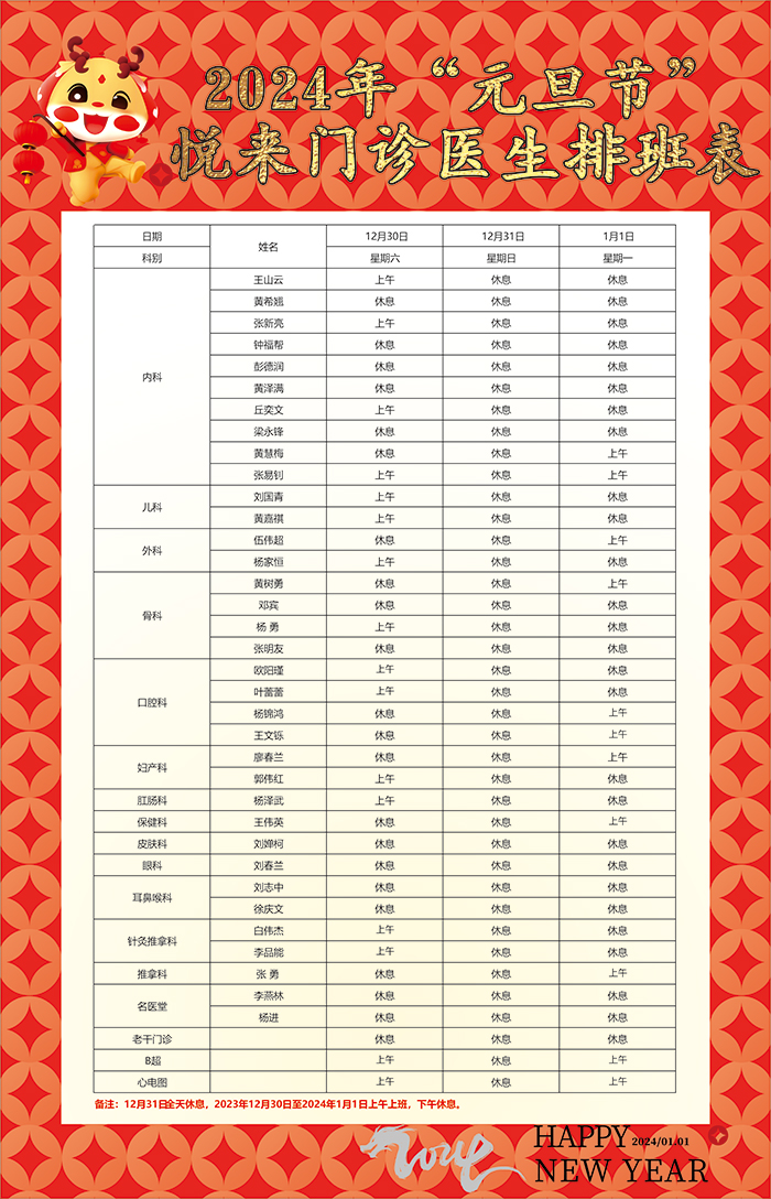 2024年元旦节中山市中医院各门诊部医生排班表
